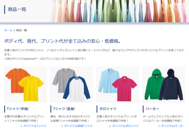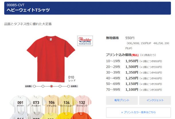 無地価格やプリント込み価格が明確に表示されています。